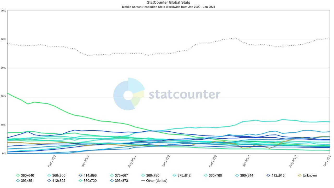 Analizando otra tabla de StatCounter sobre las estadísticas de las resoluciones de pantalla más comunes en dispositivos móviles entre enero de 2020 y enero de 2024, podemos ver que apenas hay dos resoluciones de pantalla que destacan ligeramente por encima de las demás: 360×640, que ha perdido una gran cuota de mercado, y 360×800, que ha comenzado a destacar ligeramente, llegando a un 11.08% en 2024.